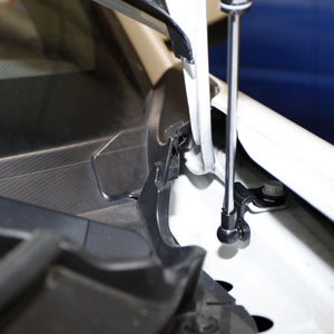 Install note: The lower attachment point is on the lower hood hinge, under the fender -- see photo.