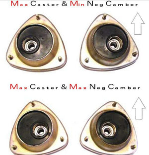 • Whiteline Com C adjustable strut mounts offer an extra 0.5 degrees of camber, and an extra 0.75 degrees of caster, for up to 5 degrees of positive caster and -3.5 degrees of camber (these numbers will vary depending on the car) without losing ride quality. The offset center means you can install them in three different configurations for varying amounts of camber and caster.