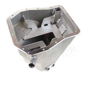The pan is precision-cast from high-strength aluminum. Computer-aided design means it fits where the factory pan did, and almost all aftermarket headers will clear it. (Ones that clear include Prosport, Perrin, Full Race, GT Spec, GP Moto, Gruppe S, and of course the OEM manifold.)