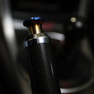 Our titanium hand brake button is created from a block of titanium by our friends at WC Lathe Werks. Once the shape is complete the button is carefully flame-heated to produce a beautiful color spectrum finish that is unique to each example.