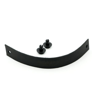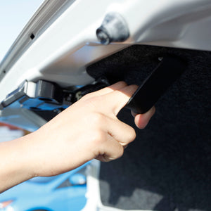 We designed an elegant solution. Our trunk handle strap is made right here at Mach V headquarters, from real leather. It is light and strong, and installs easily using the included push fasteners. The strap is even embossed with the Mach V logo so you know it's genuine. Classy!