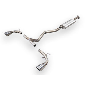 The Borla cat back exhaust is 25% lighter than the OE exhaust and showed gains of 4 whp (wheel horse power) and 6 ft. lbs. of wtq. (wheel torque) in testing by Borla! It's lighter than the stock system, too, by more than ten pounds. (Stock weight - 38.4 lbs. Borla cat back - 28 lbs.) The system features a 2.5" diameter stainless steel front pipe, and Borla's single muffler that incorporates patented Multi-Core Technology piping with 2" diameter split-rear pipes and 4.25" polished tips.