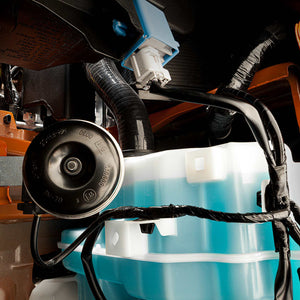 The main reservoir cap is a snug fitting injection molded plastic. A blue anodized billet cap finishes off the included fill tube for windshield washer fluid.
