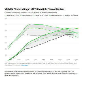 Cobb Off-the-shelf (OTS) maps for Flex Fuel are available to go with this kit. Cobb claims peak horsepower gains of 29% torque and 19% horsepower, with peak gains of up to 35% torque and horsepower over a stock car.