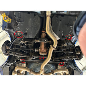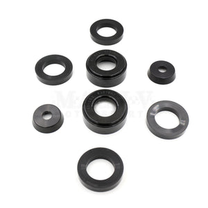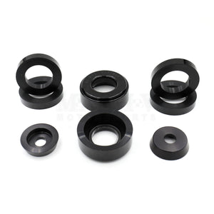 These bushings replace and augment the squishy factory rubber bushings where the rear differential carrier, and the outriggers, mount to the car. Set of six custom polyurethane bushings, plus two custom aluminum centering cones to lock the rear diff bushings in place. The four outrigger bushings fill voids in the existing rubber bushings.