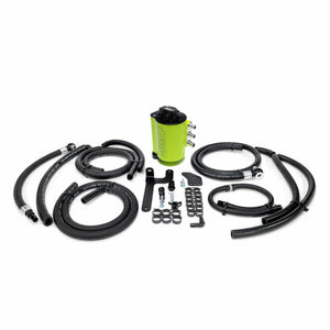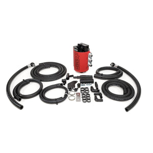 The Street Series AOS maintains the OEM PCV system functionality, but supplements its capacity. The Street Series AOS PCV discharge gasses return to the turbo inlet, retaining a PCV valve to draw additional suction, improving air oil separation. The Street Series AOS protects from oil dilution and lubrication failures in ethanol fueled application because the Street Series AOS captures fuel vapors out of the oil and returns these vapors to the intake tract for combustion. The Street Series AOS protects from both oil entrainment in the intake flow and oil dilution in the engine's lubrication system far better than the OEM PCV system alone.
