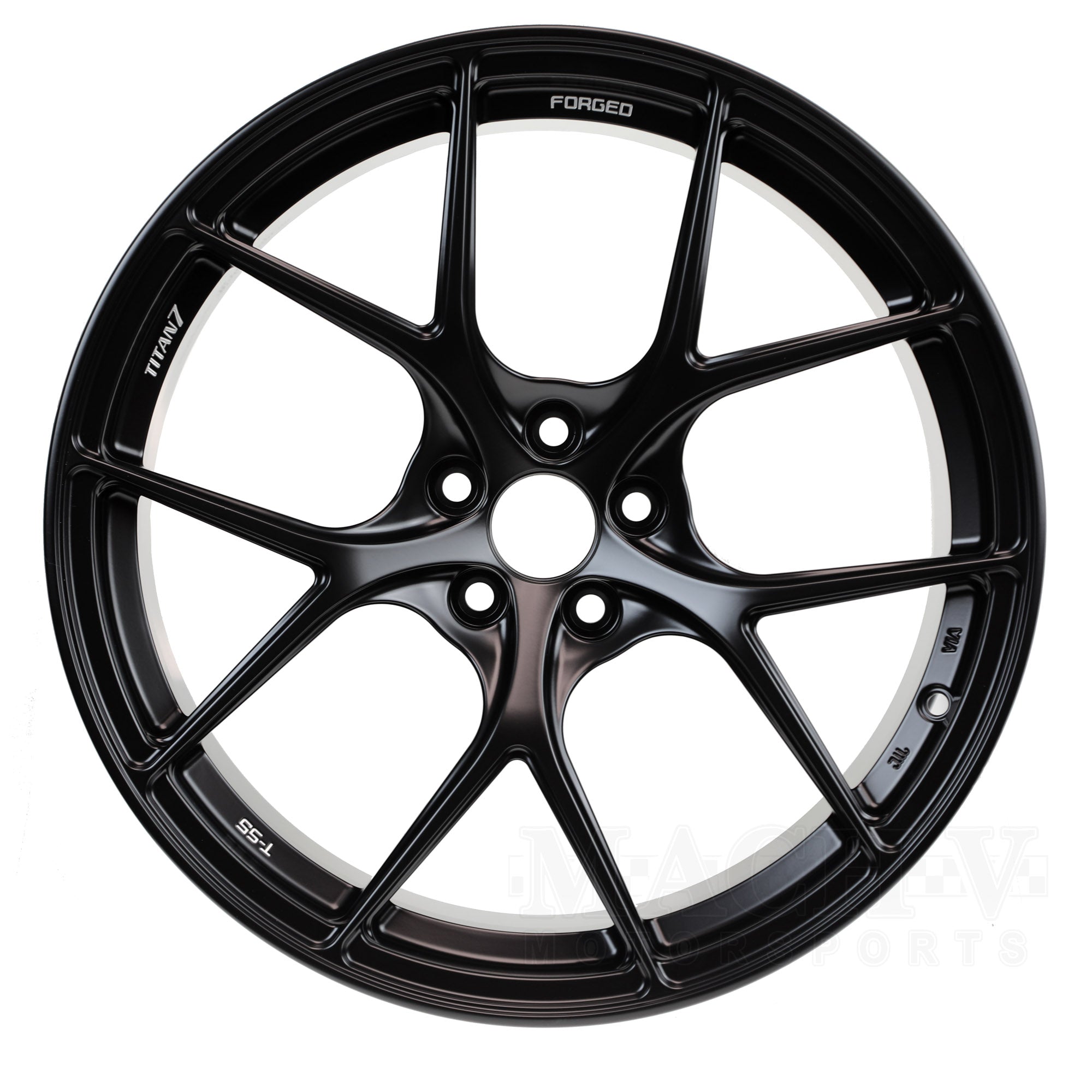 This true forged Titan 7 wheel features a forked five-spoke design with a stepped spoke detailing and a deep center cup. It's a 18x9.0" wheel with a +47 offset. The 5x100 bolt pattern fits nicely on a 2011-2014 Subaru WRX, or 2013+ Subaru BRZ/Scion FR-S/Toyota GR86. It's a particularly nice match for the 2022+ BRZ/GR86, which because of the rear fender setup on that car have a smidge less room than the older 86 cars.