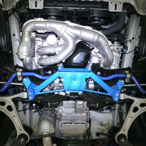 This chassis brace from Cusco installs under the front crossmember of the car to tie together the front suspension mounting points with the center floor pan, improving chassis stiffness, suspension location, and steering response. Very lightweight, strong tubular aluminum design, with a gorgeous metallic blue finish.