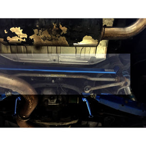 This chassis brace from Cusco installs under the rear of the car to tie together the rear suspension mounting points, improving chassis stiffness, suspension location, and steering response. Very lightweight, strong tubular aluminum design, with a gorgeous metallic blue finish.