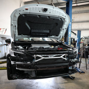 This brace ties together the left and right sections of the unibody where the radiator lives. The radiator opening is a large space with almost no bracing spanning it, so this reinforcement bar should add some stiffness to the front of the car.