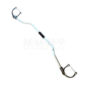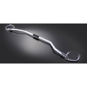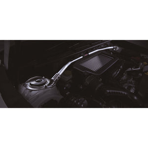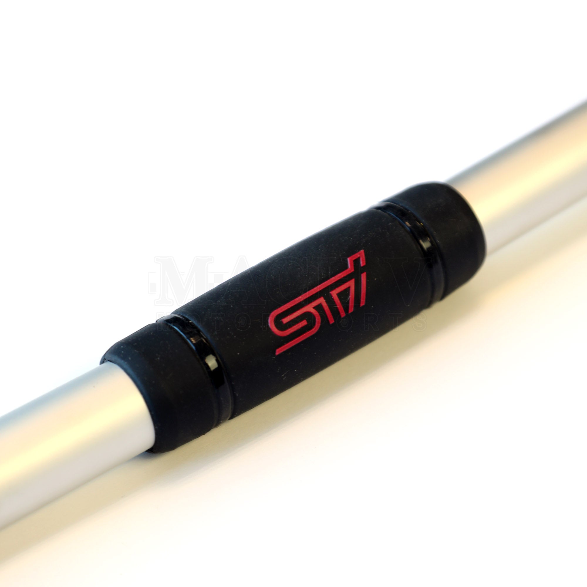 This aluminum strut tower bar from STI features a pillow ball mount in the center. This unique link in the center of the strut bar ensures no extra ride harness when load is not applied. Innovative design improves driving dynamics without sacrificing ride quality. Fitment is pretty tight between the firewall and the intercooler, and this bar will likely not fit with larger aftermarket TMIC cores.