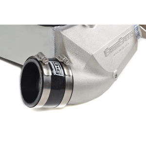 Each intercooler uses two unique end tanks. The first accepts the hot charge air from the turbo and feeds it to the intercooler core. The second receives the cooled charge air from the core and delivers it to the throttle body. These end tanks are precision cast and machined right here in Minnesota. Following inspection, end tanks are welded to high density bar and plate intercoolers before the entire assembly is pressure tested, cleaned and sealed for shipment. 5-ply silicone couplers hold their shape in extreme conditions and ensure that charge air makes it to and from the intercooler with no trouble. Splitters are laser cut from aluminum sheet and CNC bent before being assembled and powdercoated with a durable texture black finish. Stainless steel hardware secures the splitter to the factory hood scoop.