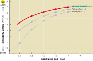 • Iridium: 8 times stronger than platinum, 6 times harder, and with a melting point 1200 degrees higher. New laser welding techniques make it possible to make a spark plug with an iridium electrode. The result is a plug that requires less voltage to spark, burns more of the fuel in the cylinder, and can spark at LEANER air/fuel mixtures (see inset diagram), resulting in higher horsepower and better gas mileage.