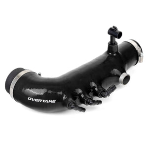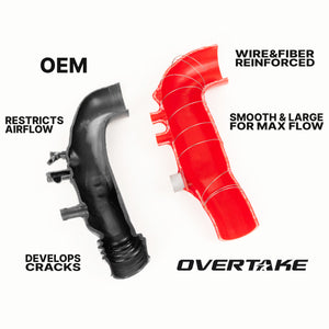 The Overtake turbo inlet hose is designed to optimize your vehicle’s airflow and performance. Constructed from durable 5-ply silicone, this turbo inlet directly replaces the stock factory inlet, significantly improving the intake tract's efficiency. The high-quality silicone construction resists high engine bay temperatures, keeping intake air closer to ambient temperature for optimal engine performance. Reinforced with steel wire, this inlet hose prevents collapse under high vacuum conditions while still providing necessary flex between the engine and intake.