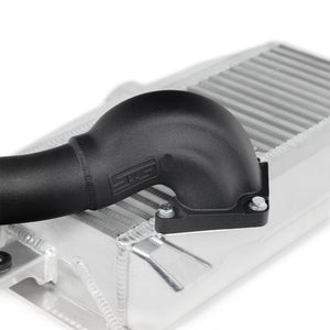 Our Charge Pipe is a direct bolt-in replacement for the factory pipe. Our Pipe utilizes mandrel bent 2.5" 6061 aluminum piping throughout as well as a stepped 5-layer silicone coupler between the lower and upper sections to maintain a consistent flow throughout the entire system. The Upper Pipe includes a cast aluminum intercooler elbow with greatly improved inner geometry when compared to the OEM pipe, allowing for a smoother transition into the intercooler end tank.
