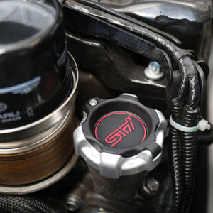 Depending on which engine style and which oil filler neck, the STi logo orientation when tight may vary; don't call us complaining that it's not facing the way you want.