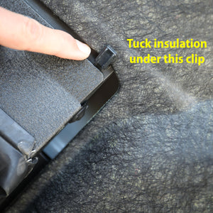 Our OEM kit includes that JDM hood insulation pad, plus ten pop-fasteners to attach it to the hood. Installation takes just minutes. Do make sure that the hood insulation is tucked into the two plastic retention clips by the scoop. (See detail photo.)