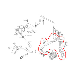 These are OEM Subaru high pressure power steering lines that go from the power steering pump to the rack, and then from the rack halfway to the power steering fluid reservoir. (See diagram.)