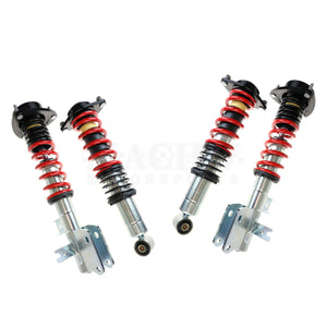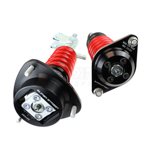 Featuring single adjustable dampers, a wide range of height adjustment, adjustable front LOWERING camber plates, rear lowering mounts, and a unique color scheme, these coilovers are at home on the road and track. Specialized damper valving is designed to provide both excellent ride quality and control in corners. Damper adjustments allow the user to dial in the ride, with a usable range.