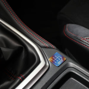The plate is laser-engraved with the dogleg-right reverse six-speed manual shift pattern on it, and an STi logo is added to complete the look.