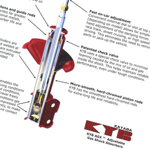 KYB is one of Japan's premier shock builders. Their AGX product provides adjustable dampening without having to move to a coil-over suspension. The AGX struts are generally a little more firmly-damped than stock struts, so they work great with moderate lowering springs.