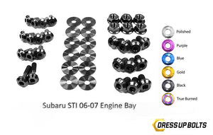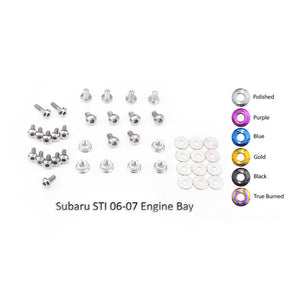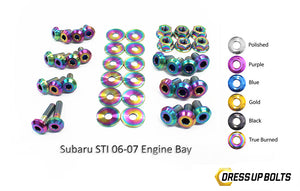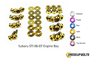 Complete your engine bay! This terrific kit transforms your engine by by replacing boring fasteners with anodized genuine TITANIUM fasteners, in your choice of colors. Installation is easy -- just unscrew the existing fastener and replace it with the corresponding one from the kit. Kit includes bolt, nuts, and washers -- 41 high-quality titanium fasteners in all. Choose from polished fasteners, or anodized blue, black, purple, gold, or "True Burned" multi-color, which looks like flame-treated titanium.
