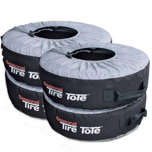 A heavy-duty shell with an easy-to-carry handle slips over the tire to protect clothing and a vehicle's interior from tire and brake residue. In their totes, tires stay neatly covered and stacked until the next season rolls around again.