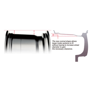A new conical barrel design gives excellent brake clearance, and these wheels will clear all OEM Subaru brakes, including four-piston and six-piston STi Brembo brakes. The barrel has also been enhanced with anti-slip knurling to prevent tire slippage under high-torque acceleration or breaking conditions.