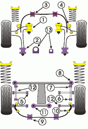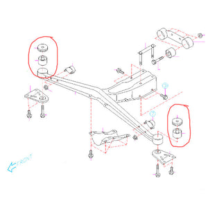 This rear differential outrigger bushing set replaces the squishy stock rubber bushings. (They are number 8 in the diagram, although the diagram layout is a little confusing.) Sold as a set of two. Includes grease. NOTE: the right side are not symmetrical; please carefully follow the included instructions.