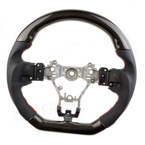 The wheel is about the same diameter as stock -- it couldn't get too much smaller without obscuring the gauge cluster -- but the rim is much thicker, making it easier to grip. Further adding to the ergonomics are contoured finger and thumb indents both above and below the 9 o'clock and 3 o'clock spokes. The perforated leather is tightly wrapped and finished with red stitching. Glossy, seamless carbon fiber graces the top and bottom rim segments.