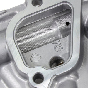 Each IAG Stage 2 oil pump starts life as an OEM spec 11mm oil pump, straight from Subaru. IAG completely disassembles the new oil pump including pulling the rotors, backing plate & pressure relief valve. Next, the main body is fixtured in our in-house 5-Axis Centroid CNC machine where the inlet and outlet passageways are CNC ported. This allows for a larger, more consistent pathway for the oil into and out of the gerotor internals and helps to prevent cavitation. The Oil Pump Outlet where it meets the engine block is also CNC “Port Matched”, for a perfect transition into the engine block. The Inlet and Outlet sides of the gerotor are also opened up on the CNC mill to reduce inlet side cavitation, and to reduce outlet side pressure drops.