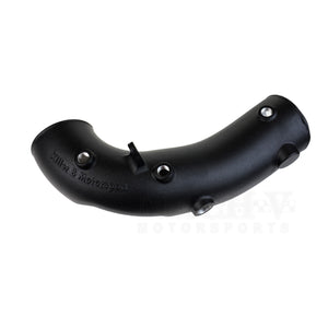 This pipe is available in two versions: The standard version with all the stock ports, or a speed-density version that deletes the port for the compressor bypass valve. The pipe is finished in black powder coat.