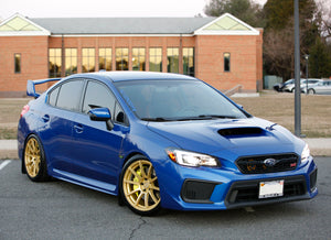 Offset is +42, which is a nice compromise that allows running a wide tire, but also gets the edge of the wheel out flush with the edge of the fenders. We suggest a 265/35R18 tire on 2008-2014 STI or 2015+ WRX/STI. The 2015+ cars can also run a 255/40R18 or 255/35R18.