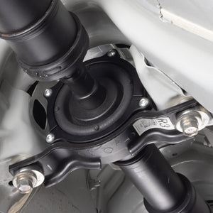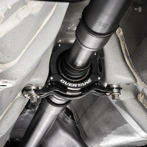 Every time you get hard on the throttle, your driveshaft is fighting against soft factory rubber that was designed for comfort, not performance. That rubber allows the carrier bearing to shift and flex, which throws off driveshaft alignment and robs you of clean power delivery. The Overtake Driveshaft Lockdown Kit fits directly over your existing OEM carrier and locks it firmly to the chassis, eliminating the deflection that causes wheel hop and drivetrain slop. The result is a more planted, more predictable car that puts power down cleaner, whether you're launching at the drag strip or just merging onto the highway. Expect a minimal increase in NVH, but most drivers find the trade-off well worth the improved feel and response.