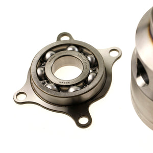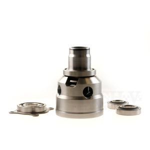 Subaru now offers a five-speed differential with updated bearings. Our kit comes with the differential itself, plus the updated roller bearings needed to make this a one-shot job. The new, updated diff comes with a new bearing pressed onto the snout, and a modern, more robust snap ring as opposed to the spiral ring they used to use. The other three bearing sets are updated units that Subaru introduced some years ago.