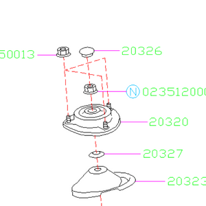These OEM Subaru strut top mount locking nuts hold the suspension top hat to the car. Note that tightening torque on these is quite low! Over-tightening can break the studs. Torque to 14.5 lb-ft.