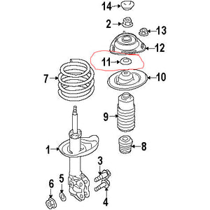This cone-shaped washer sits in between the upper spring perch and the strut top on the front of almost every Subaru. Note that the smaller side of this washer should point UP, not down!