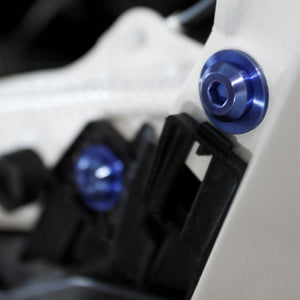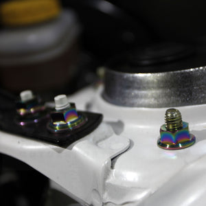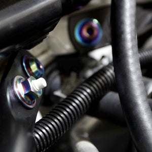 Complete your engine bay! This terrific kit transforms your engine by by replacing boring fasteners with anodized genuine TITANIUM fasteners, in your choice of colors. Installation is easy -- just unscrew the existing fastener and replace it with the corresponding one from the kit. Kit includes bolt, nuts, and washers -- 82 high-quality titanium fasteners in all. This full engine bay kit includes just about every visible piece of hardware in the engine bay, including fasteners for the strut tower braces, battery hold down, hood hinges, and many more. (If you are looking for a more economical option, we also have a partial engine bay kit.)